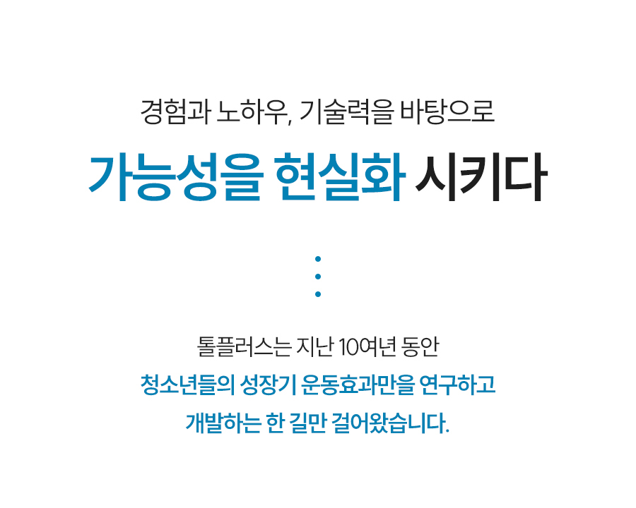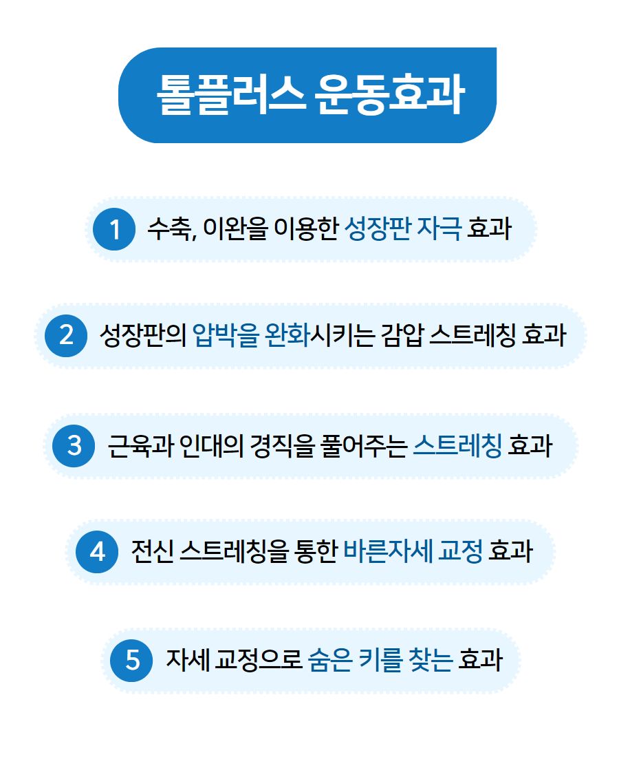 톨플러스는 여기에 성장판 자극이라는 물리적 자극 요소를 더한 보조 솔루션으로, 성장이 정체된 아이들에게 특히 도움이 될 수 있습니다.